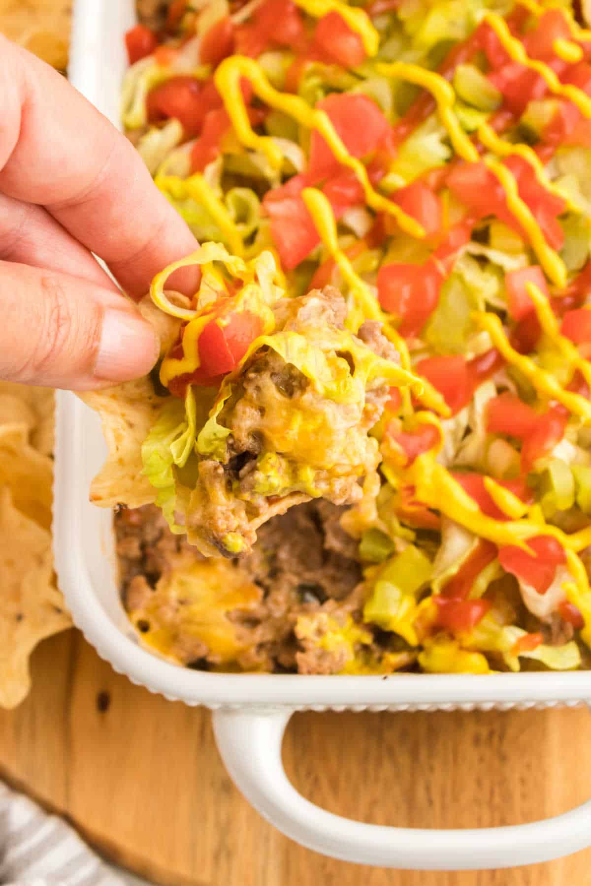 - Remove from oven. Top with shredded lettuce, diced pickles, and diced tomatoes. Drizzle with ketchup and mustard. Serve hot with tortilla chips.