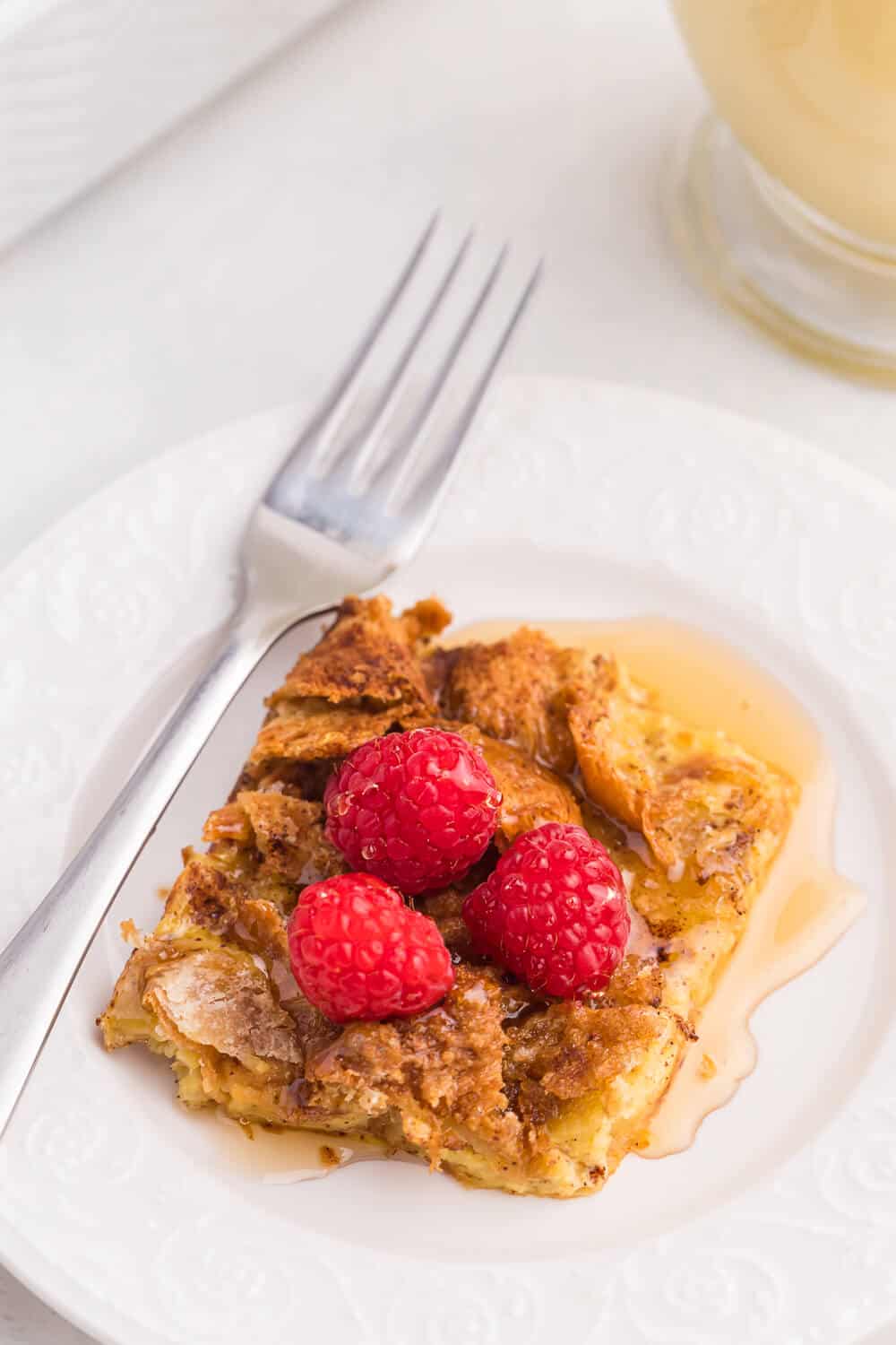 - Spray a 9x13 inch casserole dish with cooking spray. Spread croissants on the bottom of the dish. Set aside.