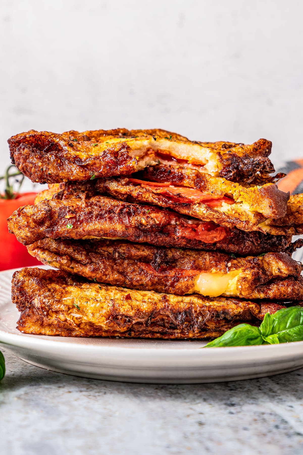 - Assemble each sandwich by placing a slice of tomato and mozzarella on one slice of bread, top with pepperoni, then cover with another bread slice.