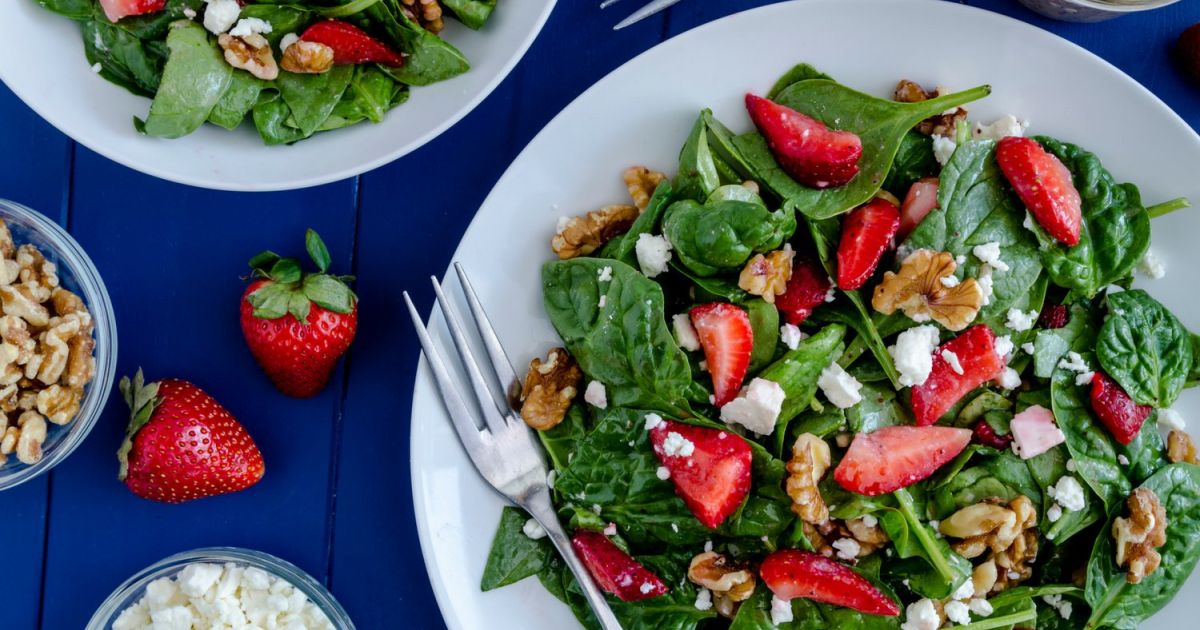 - Add sliced strawberries and crumbled feta cheese to the spinach.