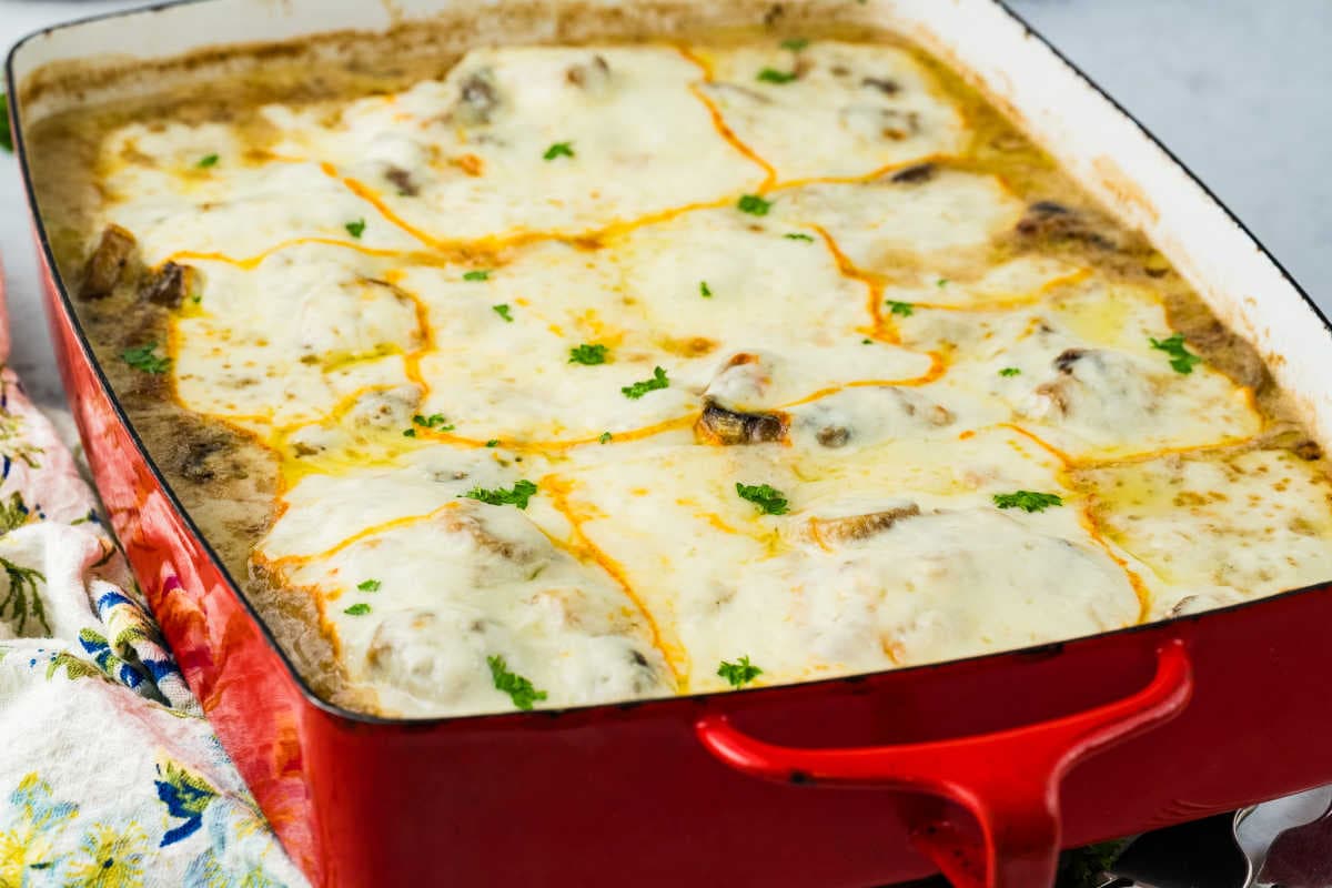 Creamy Chicken Gloria is a delightful dish featuring tender chicken breasts topped with a rich mushroom and cream sauce, melted Muenster cheese, and savory herbs. Perfect for a comforting dinner!