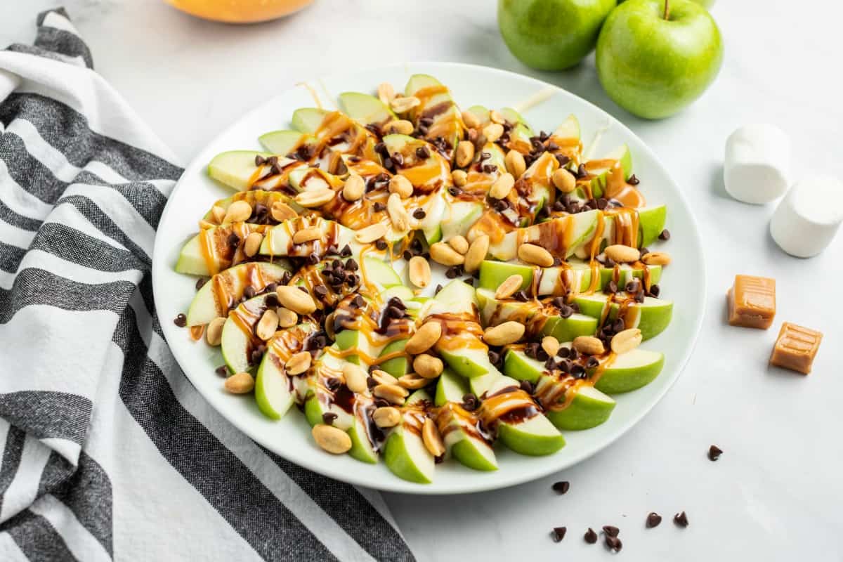 - Pour marshmallow cream over apple slices, followed by caramel sauce. Drizzle chocolate syrup and sprinkle with peanuts and mini chocolate morsels. Serve immediately and enjoy!